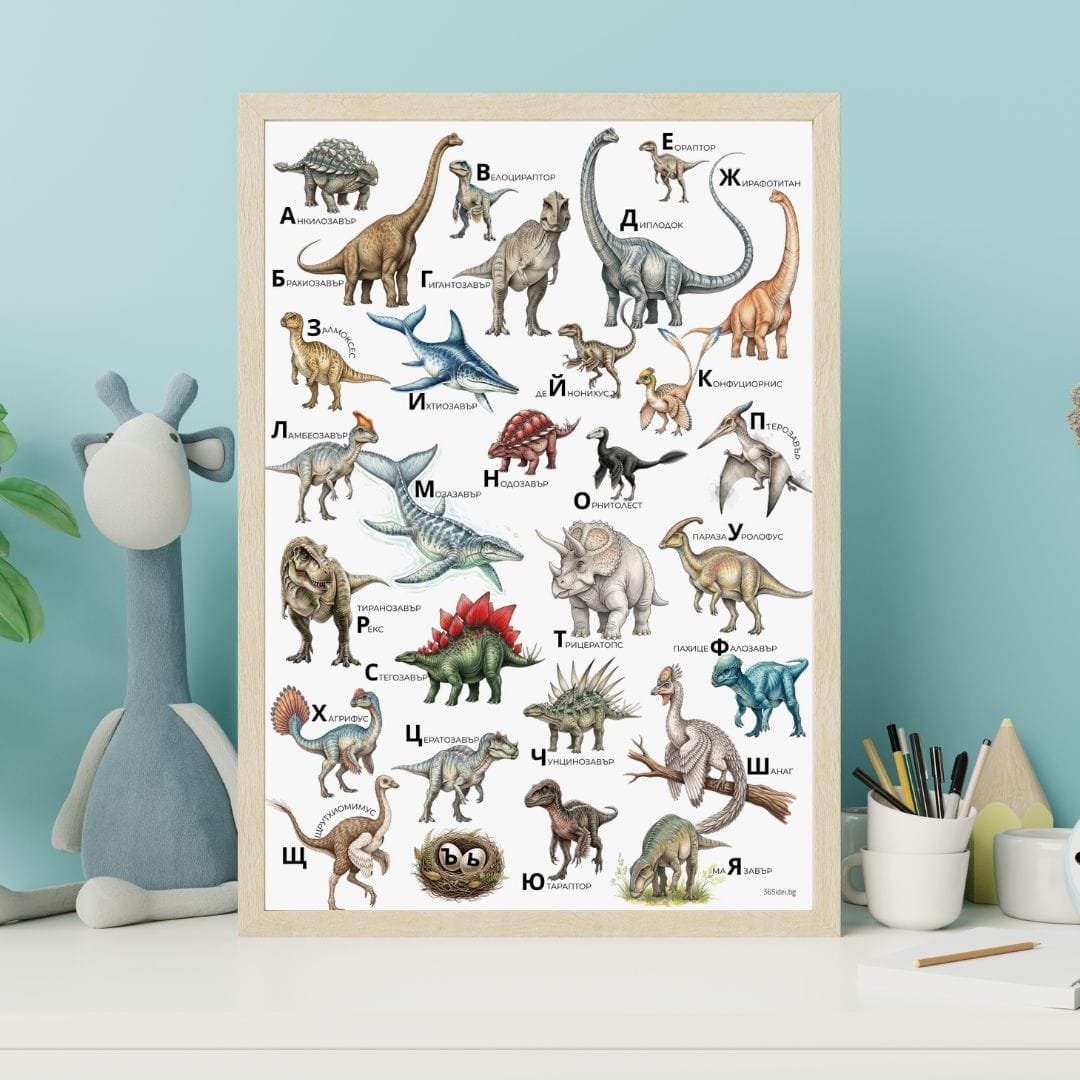 За всяка буква динозавър. Плакат за млаки откриватели и големи мечтатели.